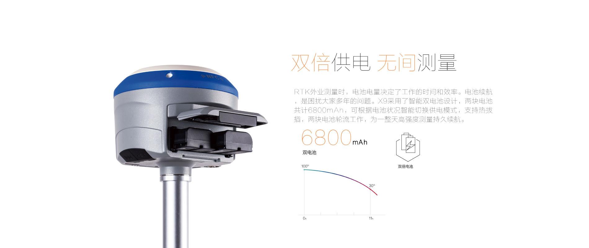 RTK模式12小時,可外接直流電,雙電池電源自動切換
